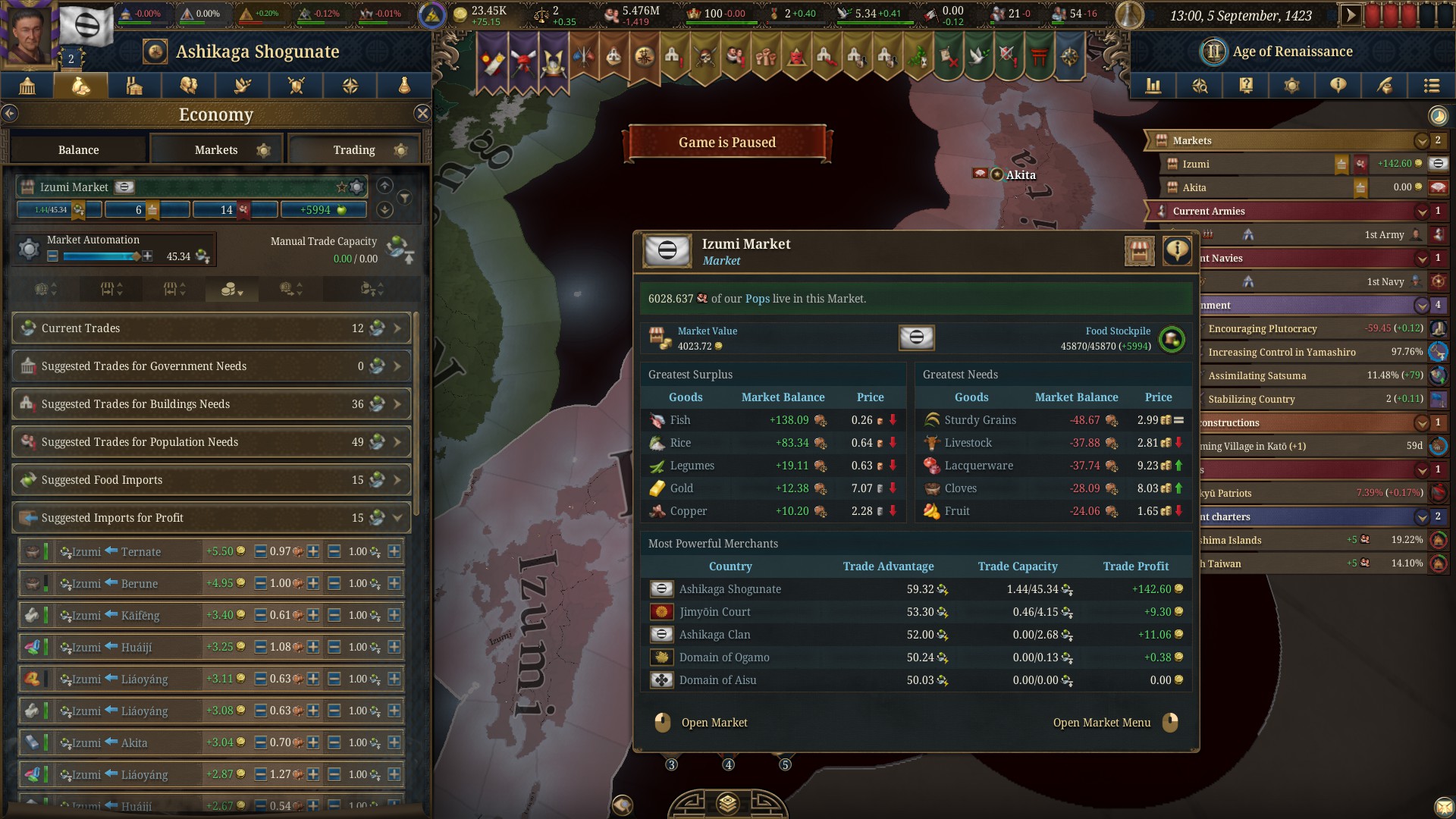 You have the option to handle everything in the game yourself, or use the automation system in EU5 to help. It’s a powerful feature – you can even let it play the game for you if you just want to observe. However, the best part is that it lets you delegate tasks, just like a real leader. For example, I used automation to handle all the trading mentioned earlier. You can also prevent the AI from interfering with specific tasks, like ensuring a consistent supply of grain. Plus, you can split your trade capacity between automated and manual control, giving you a great way to manage everything.