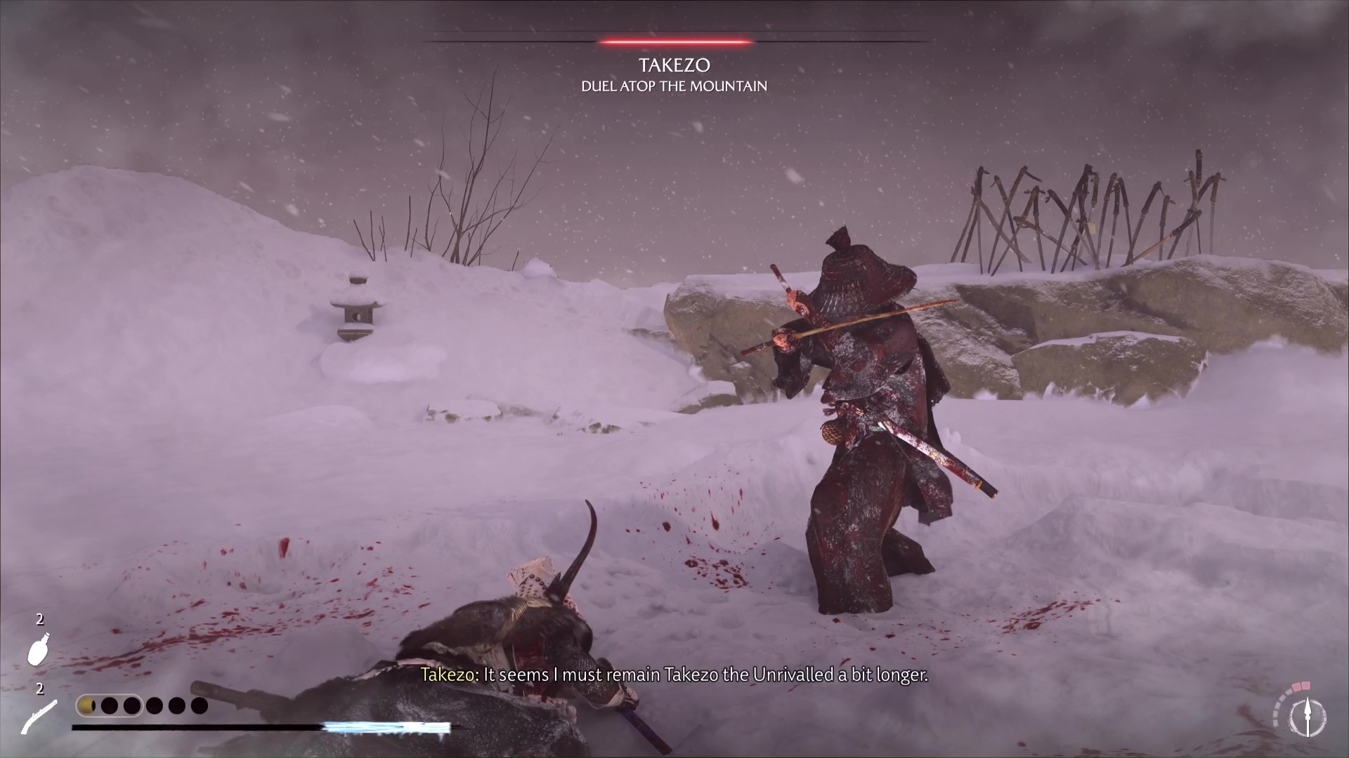 You might need a few attempts to defeat Takezo, and we suggest using your first try to learn how he moves and attacks. At the beginning of the fight, before the blizzard starts, he’s easily hit with the pistol, which will create openings for you to attack. It’s a good idea to use all your pistol bullets during this phase, as he’ll start blocking them once the blizzard arrives and the fight gets harder.