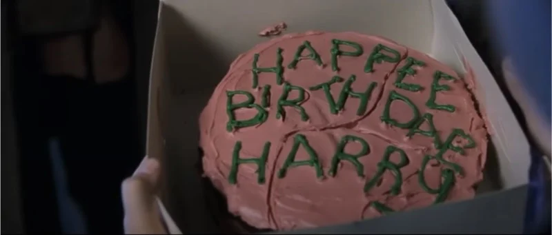 The birthday cake Hagrid gives Harry isn’t perfect – the pink icing message is intentionally a little messy and misspelled. If you look closely, the letters actually change shape and move around between shots. Crumbs and icing smears seem to jump around the edge of the cake, and by the time Harry puts it down, the cake looks noticeably different than it did at first.