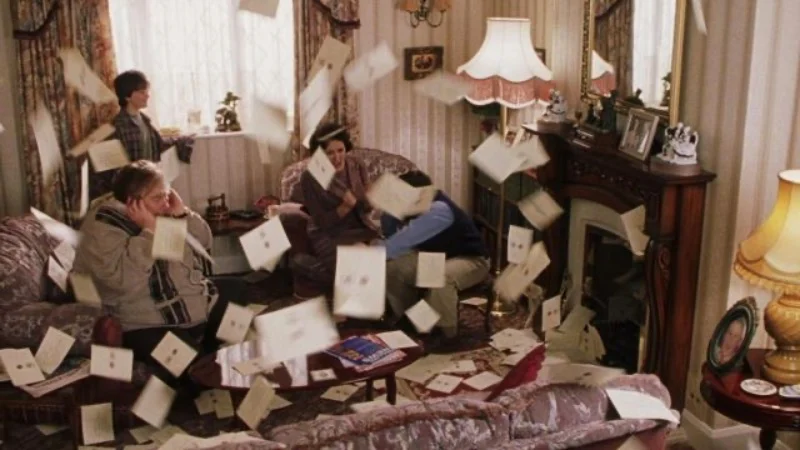 Hogwarts letters flood the Dursleys’ living room, all appearing to be written in elegant green ink. However, as the letters fly around, some strangely change – their addresses disappear, or the handwriting becomes different. Even the wax seals aren’t always in the same spot. Harry picks up a letter that visibly alters – its position and the lines on the envelope shift with each camera angle.