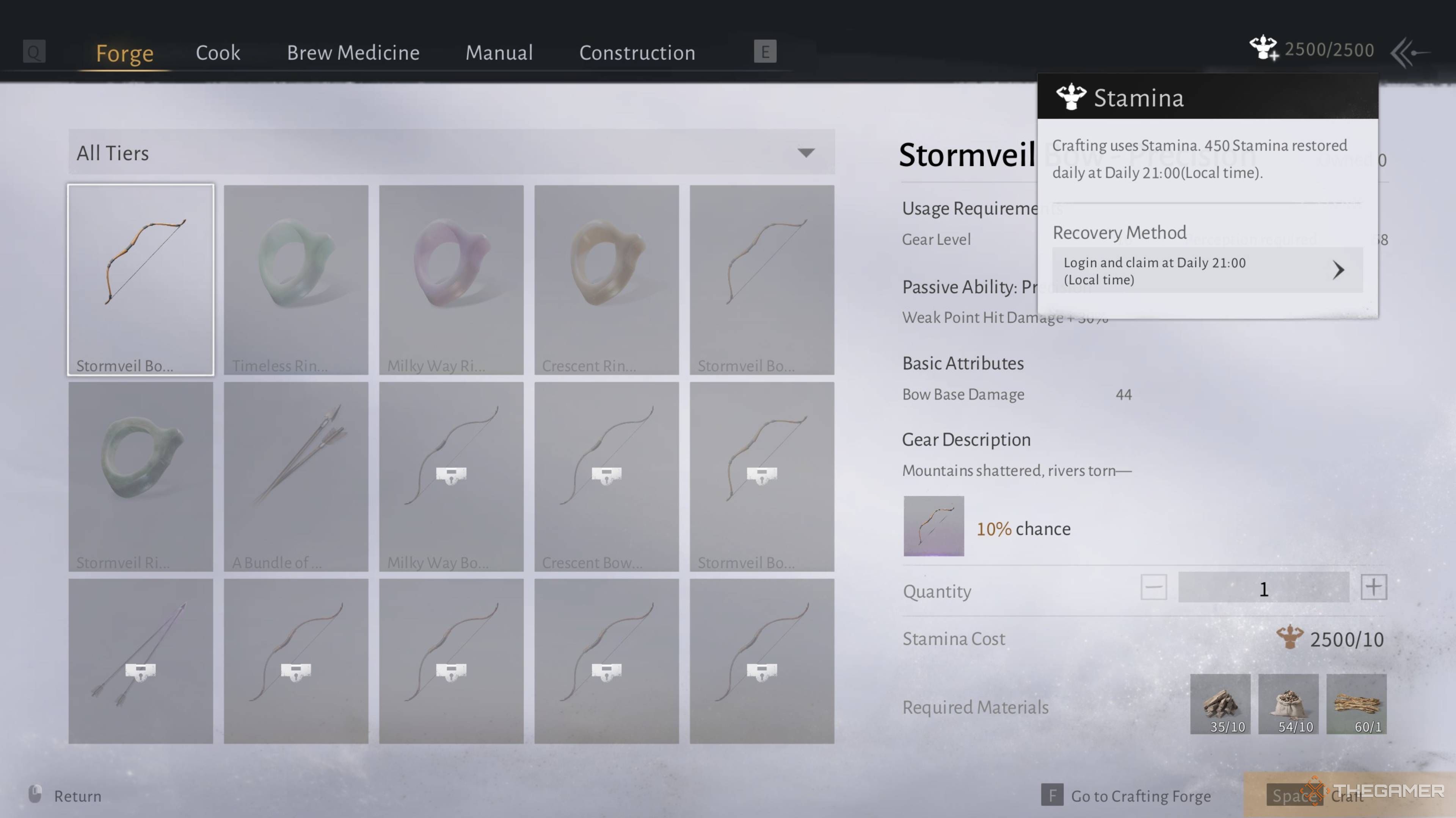Crafting most items doesn’t use much Stamina – usually around ten points. Building materials often cost even less. With a total of 2,500 Stamina, you shouldn’t have to worry about running out anytime soon.