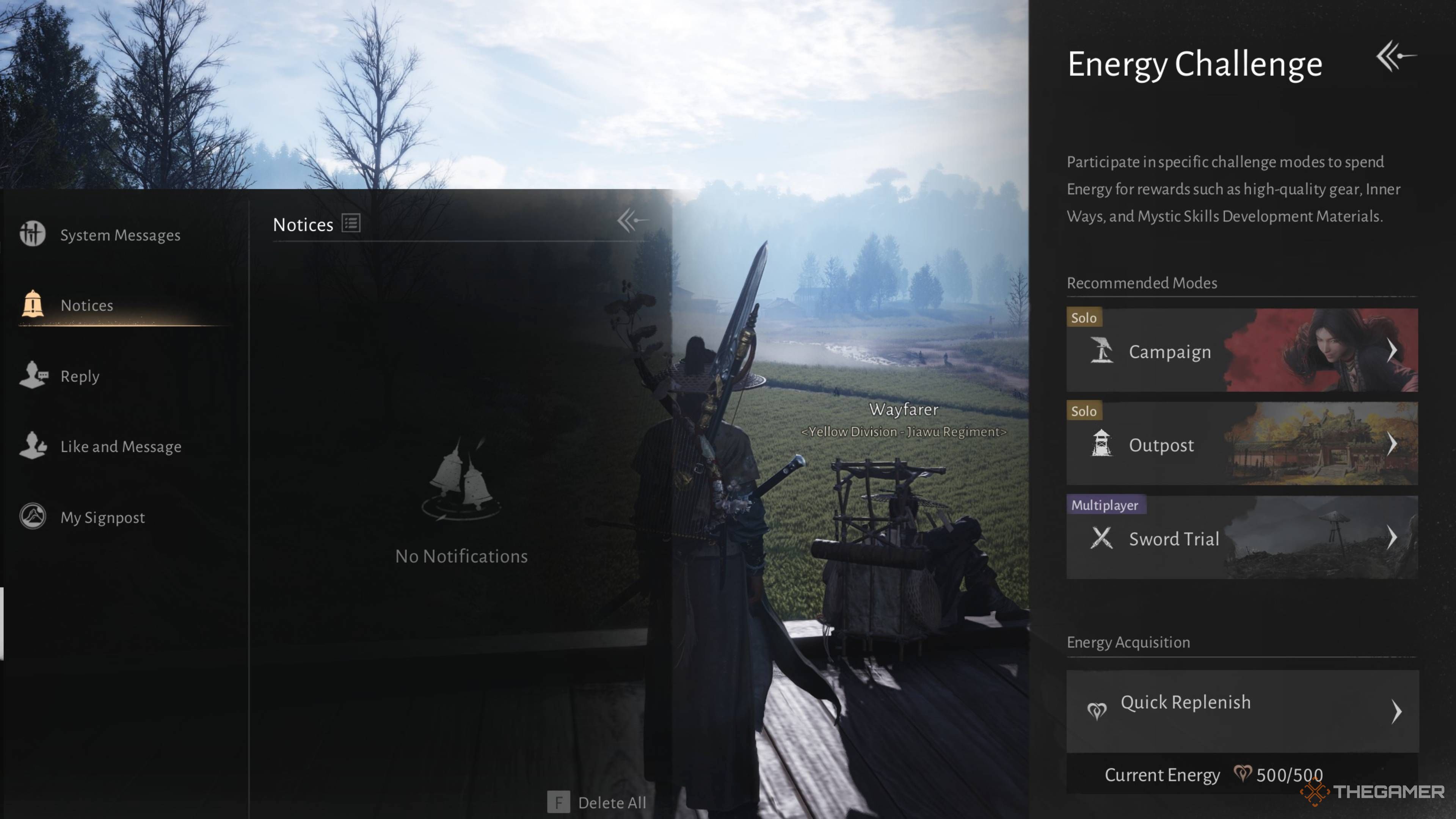 Challenge Energy is your main stamina bar, visible in the top-right corner of the map. It’s used to replay open-world activities like Campaigns and Outposts, as well as the Sword Trials multiplayer mode.