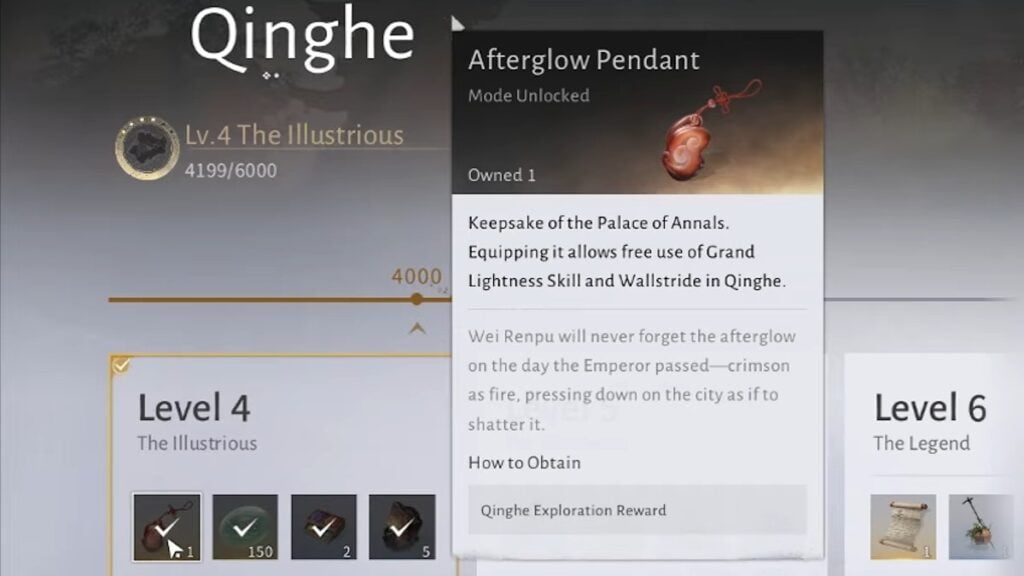 Keep track of your exploration progress in the area menu. You’ll get a pendant when you reach Exploration Level 4 in Qinghe. Remember, only points and the pendant earned in a specific region count towards unlocking Lightness Skills in that same region – pendants from other areas won’t work.