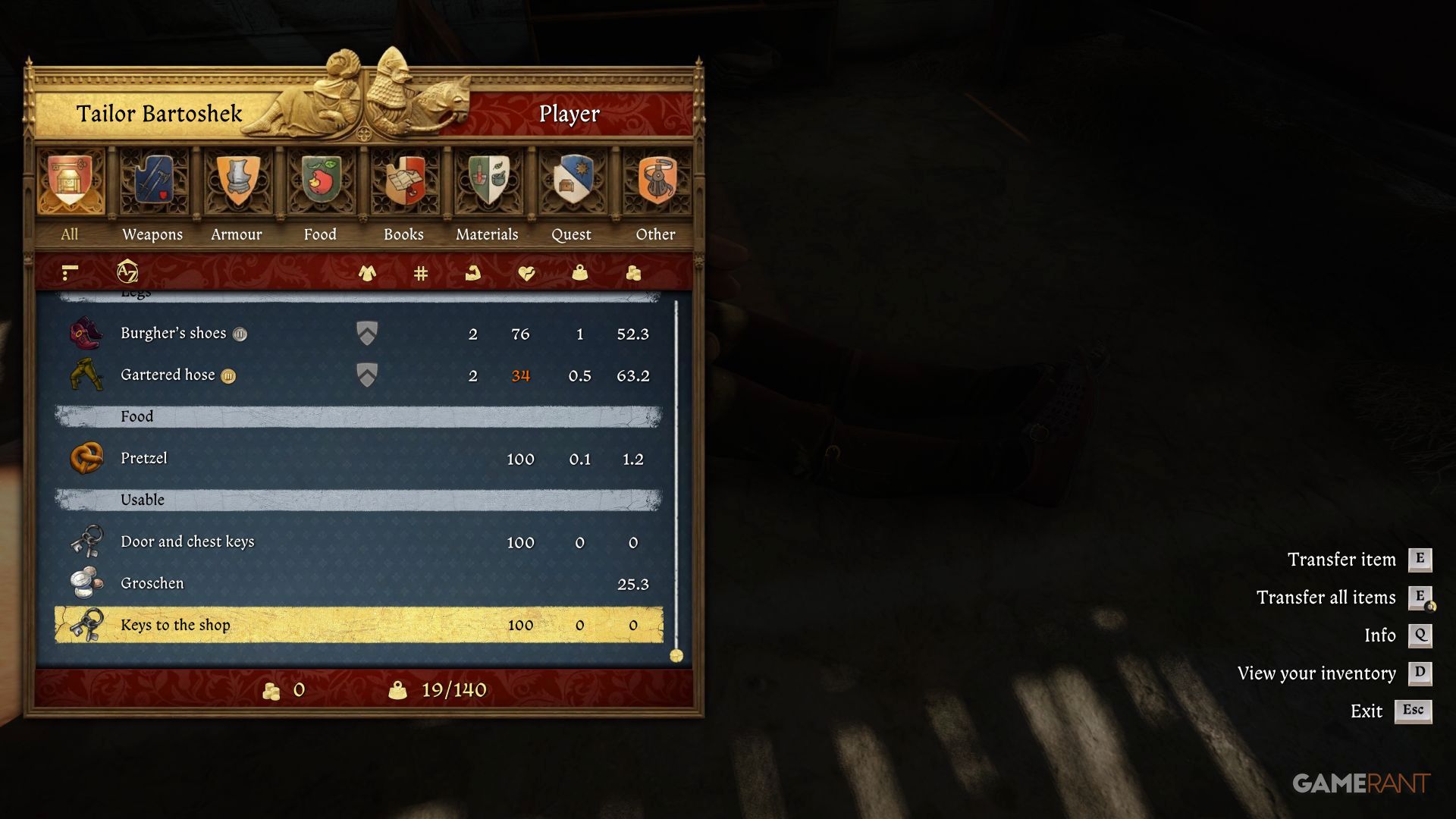You can find all of Bartoshek’s clothes in a wooden chest within his shop. There are multiple ways to sneak in and steal the Tyrol Brocade Cotehardie dress, which is needed for a companion.
