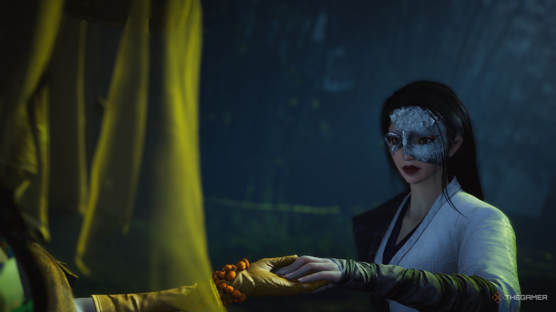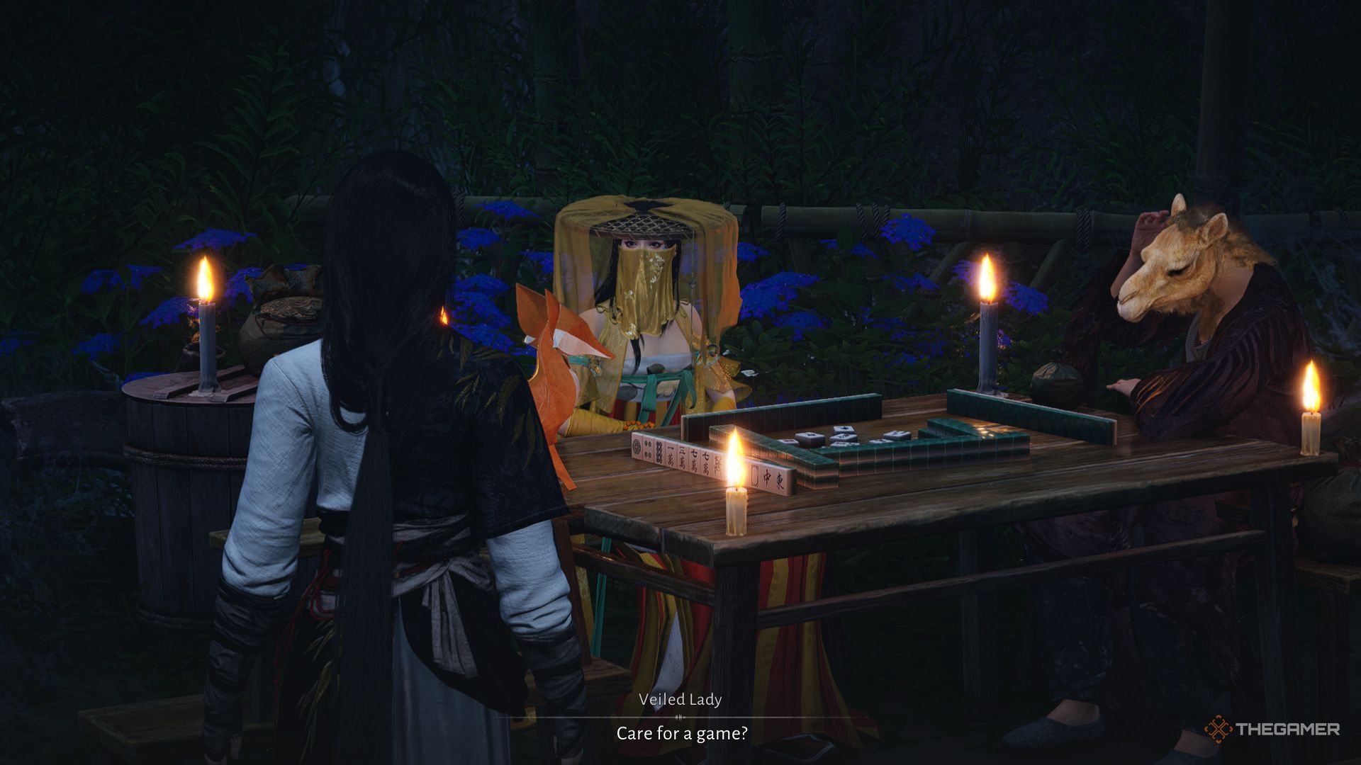 After watching a peculiar cutscene, talk to the Veiled Lady. She’ll be at the table playing Mahjong in the shed, behind you.