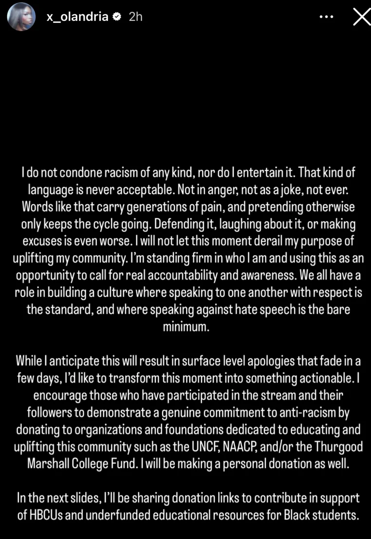 On October 29th, Carthen publicly denounced the harmful language used during the livestream on Instagram. She explained that such words inflict deep, historical pain and ignoring that fact only perpetuates the problem. Carthen made it clear she condemns racism in all forms – whether expressed in anger, as a joke, or otherwise – and stressed the importance of taking responsibility and raising awareness. She announced she would be donating to organizations that support the Black community, such as UNCF, the NAACP, and the Thurgood Marshall College Fund, and encouraged others to do the same.