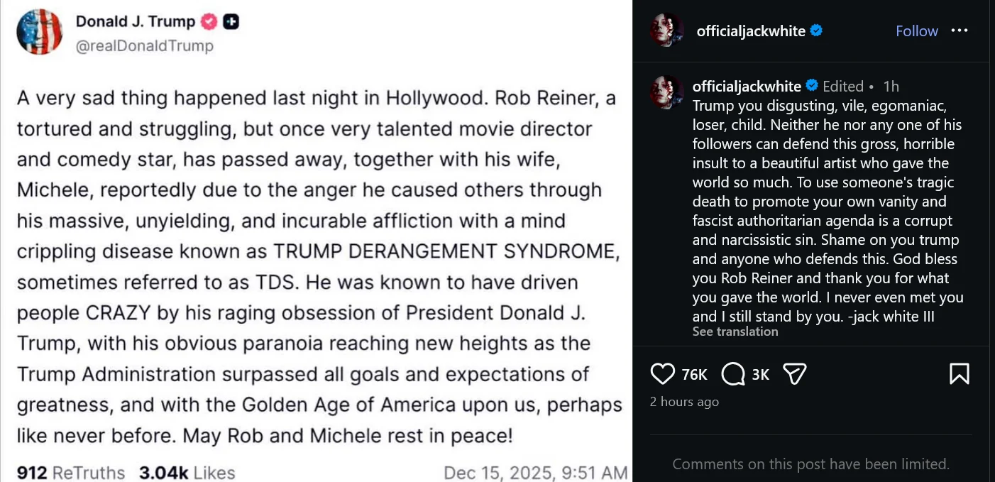 Following the tragic deaths of actor and director Rob Reiner and his wife, musician Jack White publicly condemned Donald Trump. Trump had made contentious statements after the news broke. Police are investigating the deaths as a possible homicide, and the couple’s son, Nick Reiner, has been taken into custody.