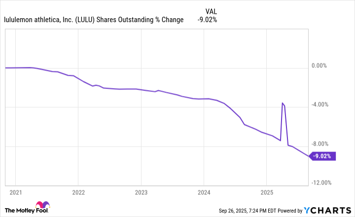 And here we arrive at the crux of the matter-the dividend hunter’s keen eye. Even in the darkest of hours, Lululemon is not without its merits. The company, while contending with slow growth, is still producing returns for its shareholders. Through share buybacks, the number of outstanding shares has dwindled at an accelerated pace, ensuring that earnings per share (EPS) will climb. And as anyone with an eye for dividends knows, a shrinking float means a more potent earnings per share ratio-a delicious treat for the patient investor.