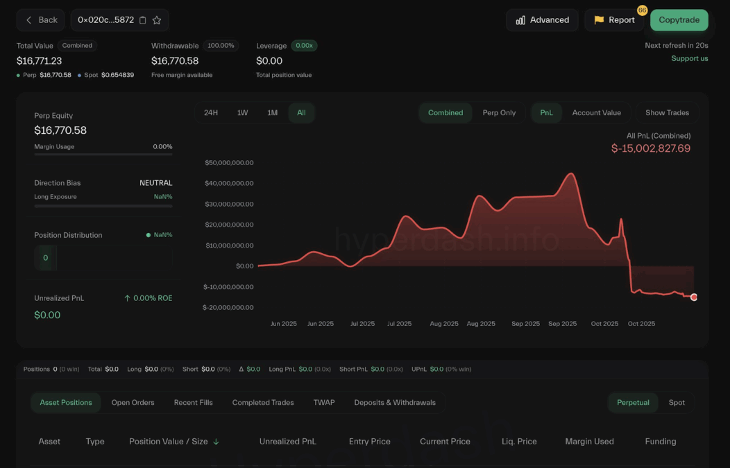 “Machi Big Brother has been fully liquidated, with only $16,771 left in his account – marking a total loss of over $15M.” – Lookonchain (@lookonchain), November 3, 2025