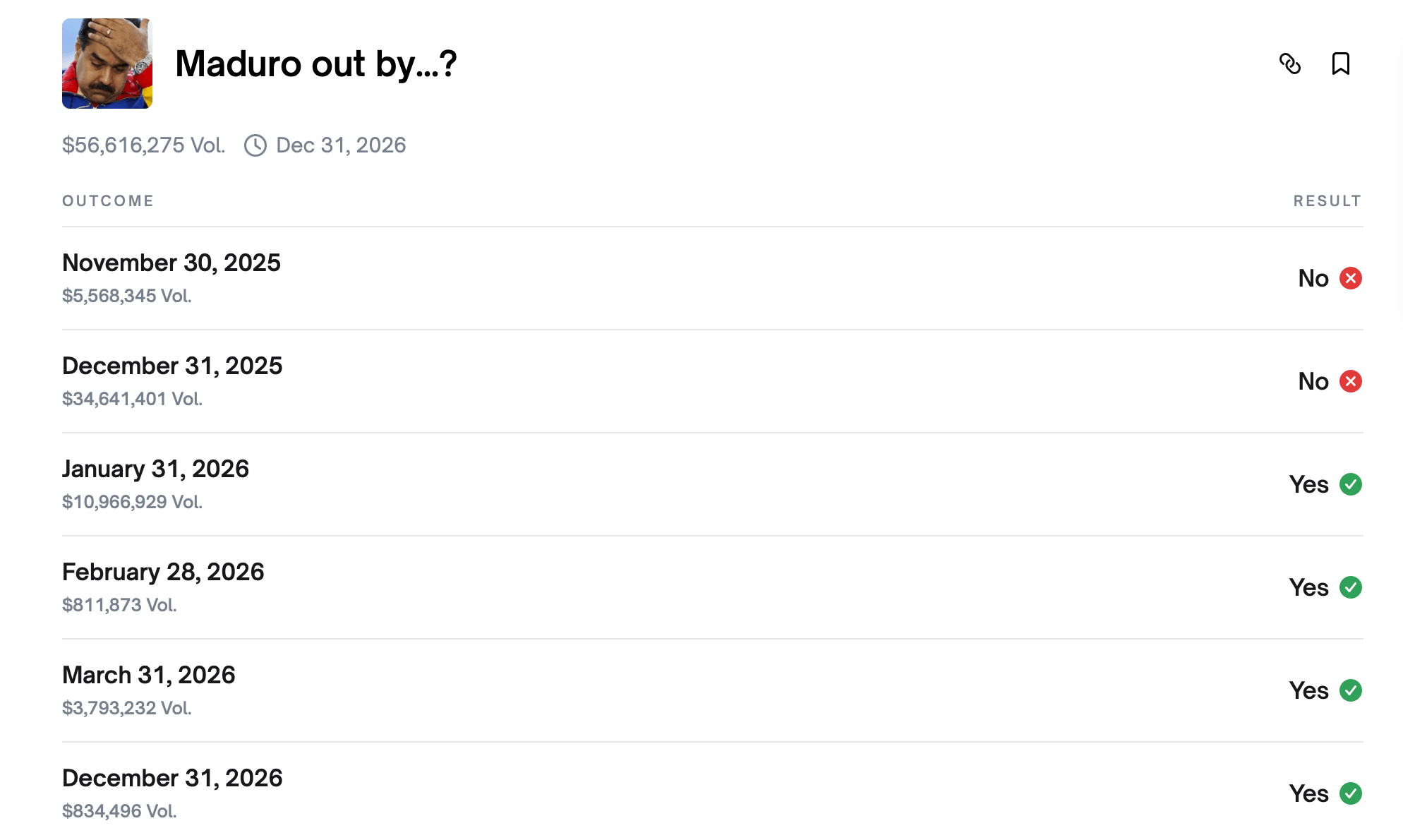 Meanwhile, over at Polymarket, traders are popping bottles. 🍾 One contract betting on Maduro’s removal by Jan. 31 resolved as “Yes” on Jan. 3. Boom. $56 million in volume. That’s a lot of avocado toast. 🥑