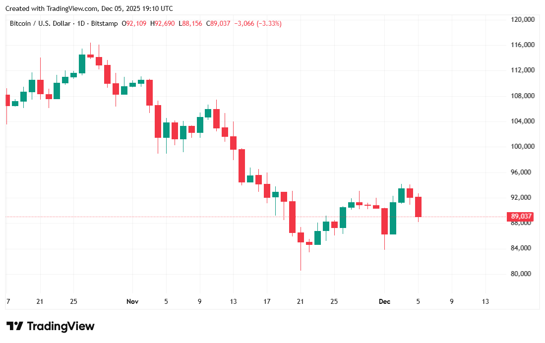 Bitcoin was priced at $89,018.14 at the time of writing, down 3.14% from yesterday’s price and also down 1.96% over seven days, according to Coinmarketcap data. The digital asset’s price fluctuated between $88,152.14 and $92,707.20 over the past 24 hours.