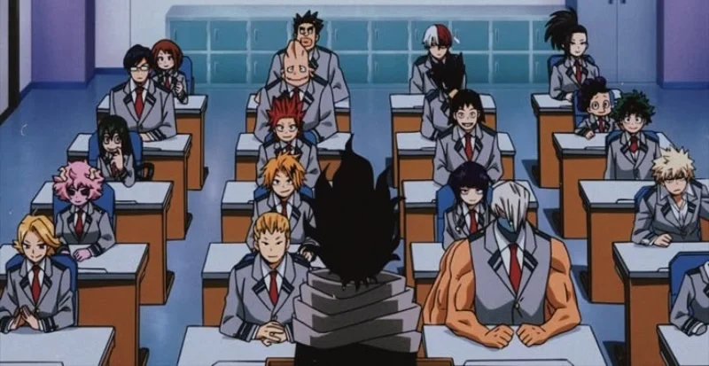 Although Class 1-A generally sits in the same arrangement, you might spot a student briefly at a different desk. They’ll sometimes appear in a different location in a wide shot, then return to their usual seat in the next scene. This is most noticeable when the camera switches between views from the front and back of the classroom.