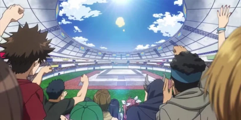 Throughout the U.A. Sports Festival, you can see signs held by audience members with names and encouraging messages. Interestingly, the text on these signs sometimes changes slightly between different camera shots. A sign that initially displays one message might appear with rearranged words or spacing when the camera focuses back after showing a reaction from someone else.