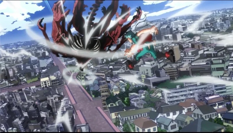 Shota Aizawa’s capture weapon has a specific range for binding enemies. However, some scenes show inconsistencies: the cloth appears to wrap around targets farther away than it should, and then, in the very next shot, the remaining length of the cloth seems too short. When comparing these frames, it’s clear the cloth stretches and shrinks instantly, without any smooth movement in between.