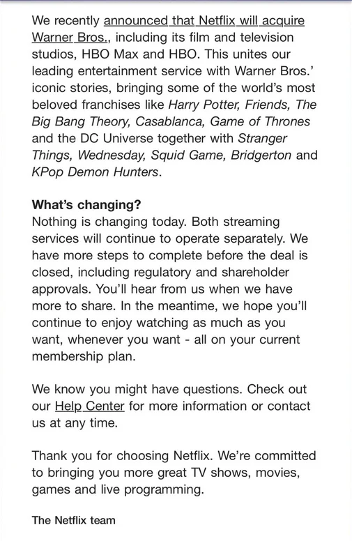 In a message, Netflix assured subscribers that things will stay the same for now. They also told people who already have HBO Max to keep using their accounts, explaining that Netflix and Warner Bros. will continue operating separately until the merger is finalized.