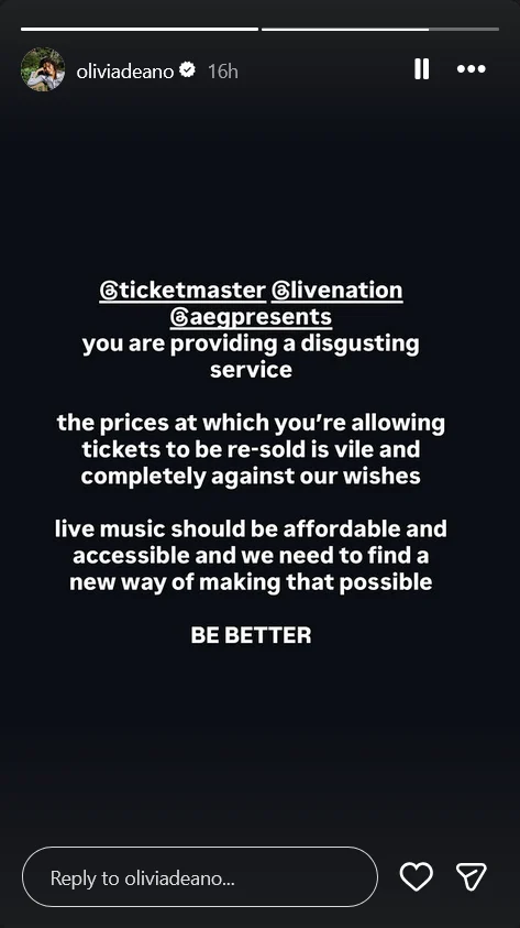 Olivia Dean, a British singer, has spoken out against Live Nation, Ticketmaster, and AEG, saying their ticket prices for her tour are too high.