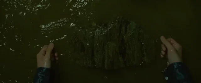 During the flood scene, the large scholar’s rock unexpectedly floats back towards Ki-woo. This makes it seem much lighter than the characters previously described, and it moves in a way a heavy stone wouldn’t. It looks less like a real, weighty object and more like a prop being used in place of one, which disrupts the feeling that it’s actually heavy.