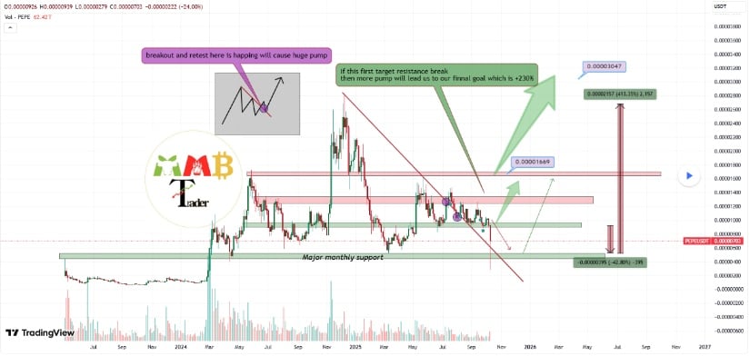 Technical analysts suggest that this pullback may have reset the market, opening the door for a new uptrend. A popular trader known as Ali (@ali_charts) highlighted a descending triangle pattern that could trigger a 78% upside breakout, provided PEPE breaks above the $0.000011 resistance zone. 🧙♂️📉