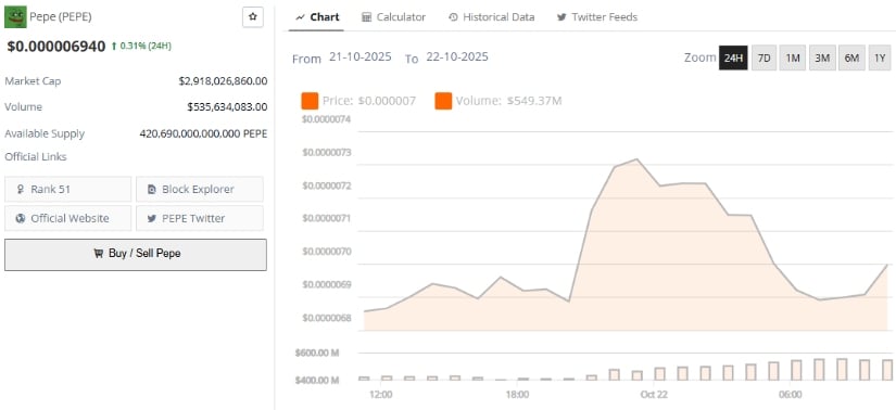 Following a dramatic 91% drop from its September levels, the Pepe coin has rebounded modestly, trading near $0.0000072 as of late October 2025. 📉➡️📈