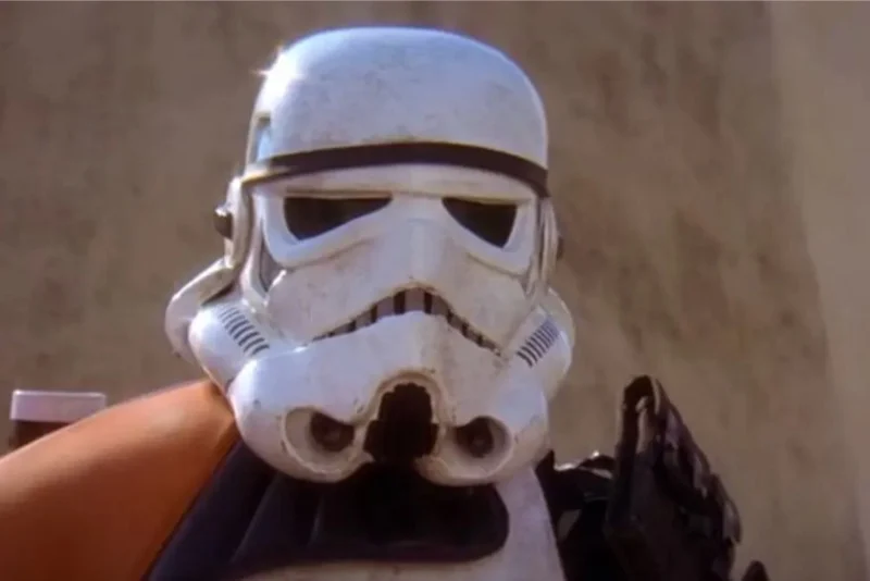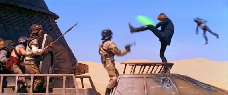 During the battle on the skiff near the Sarlacc pit, Luke attempts a high kick on one of the guards, but it’s clear he doesn’t actually connect. Despite the miss, the guard falls backward as if he were hit, and the scene continues. You can spot this moment right after Luke jumps onto the skiff and begins fighting. The camera angle makes it look like the kick landed, even though it didn’t.