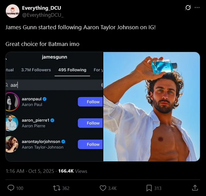 There’s increasing buzz about Aaron Taylor-Johnson potentially becoming the next Batman. A fan account on X, called Everything_DCU, pointed out that James Gunn recently began following Taylor-Johnson on Instagram. This has led to speculation that he might be the actor chosen to wear the Batsuit.