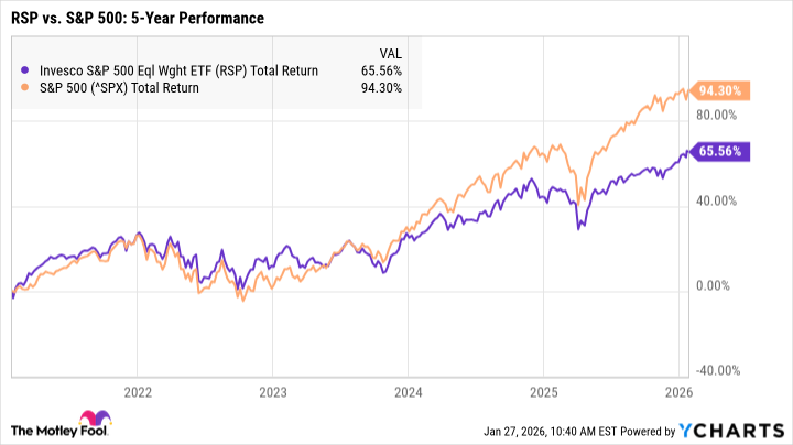 Now, there are alternatives. S&P 500 ETFs are still perfectly good investments, if you enjoy a bit of calculated risk. But if you’re looking for something a little less… concentrated, there’s the equal-weighted S&P 500 ETF. The Invesco S&P 500 Equal Weight ETF (RSP 0.04%) to be precise. It still holds all 500 companies, but gives them all roughly the same amount of influence. It’s a bit like giving every member of the committee an equal vote, regardless of how much gold they have.