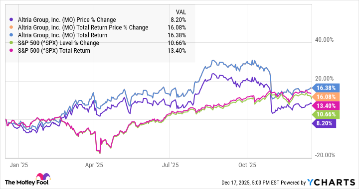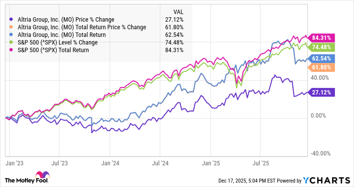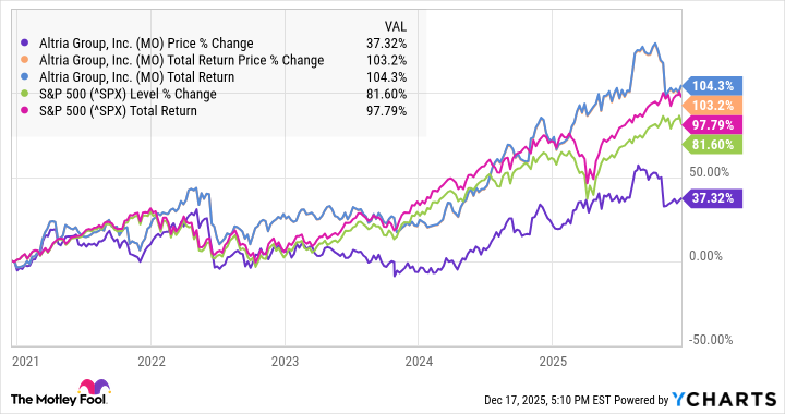 When one reflects upon the performance of this stock over the past year, three years, and indeed five years, it is clear that Altria has not outshone the esteemed S&P 500 in terms of price appreciation. However, it may still boast a modicum of success, having surpassed the broader market index on a total-return basis for both the past year and over five years, which, one might argue, reveals a certain resilience amidst adversity. The accompanying charts elucidate this comparison with clarity.