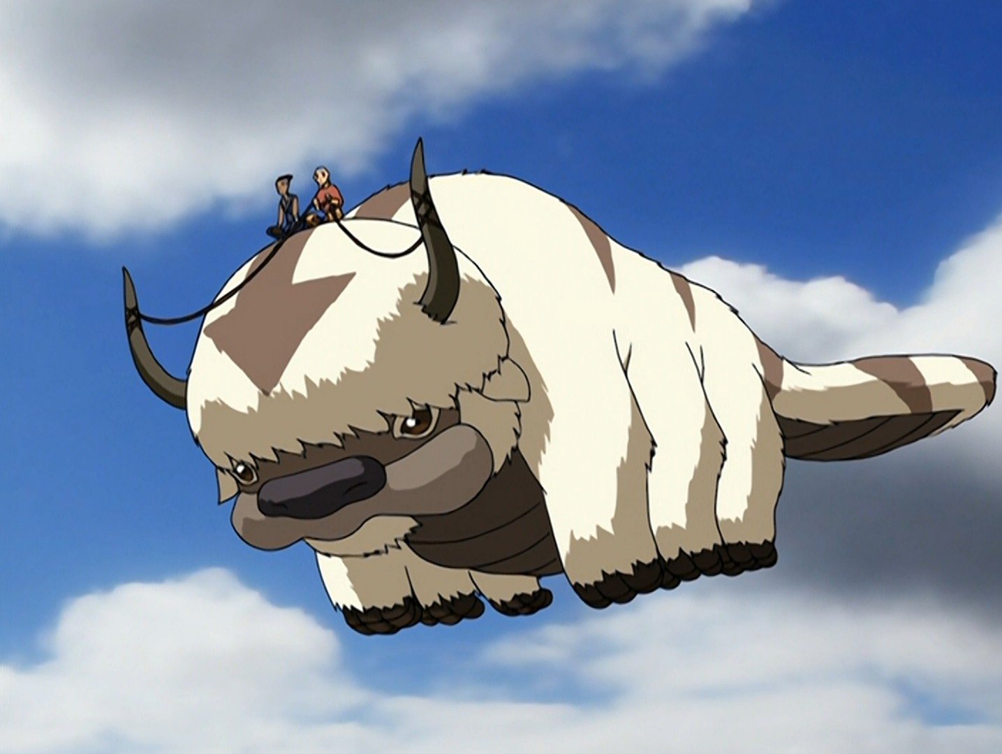 Appa flies using a unique bending ability, allowing him to carry very heavy loads without being limited by typical aerodynamic constraints. He can transport many passengers, a full saddle, and plenty of cargo, and he’s able to adjust his speed and altitude to save energy during long journeys or quickly navigate through bad weather when necessary.