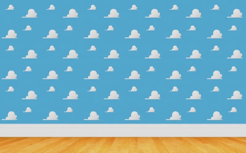 The blue wall with white clouds in Andy’s room seems to change. The clouds aren’t always in the same place or arranged the same way – sometimes they appear closer together or further apart, and even disappear and reappear. When the camera quickly changes angles, the cloud pattern also looks like it moves up or down the wall.