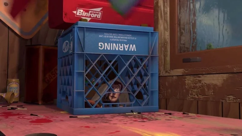 Woody finds himself pinned beneath a wobbly milk crate and a toolbox. It’s unpredictable – sometimes the crate seems to collapse, and other times it appears solid. The toolbox keeps shifting on its own, sliding towards the edge and then back again. Plus, the number of tools visible changes depending on the camera angle.