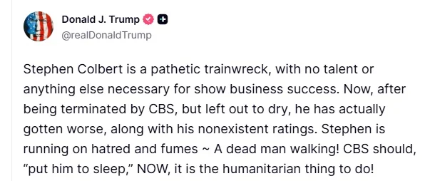 In a post on his social media platform, Truth Social, Donald Trump harshly criticized Stephen Colbert, calling him a failure with no talent. Trump noted Colbert’s recent firing by CBS and claimed his ratings are low. He went on to say Colbert is fueled by negativity and is failing, and even suggested CBS should permanently remove him from television, framing it as a compassionate act.