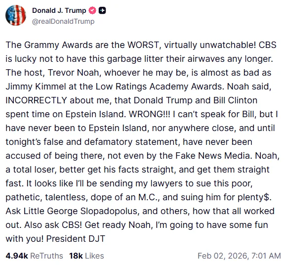 Shortly after the 2026 Grammy Awards ended, Donald Trump publicly criticized the show on his social media platform, Truth Social, calling it almost unwatchable. He particularly targeted host Trevor Noah, labeling him a “loser” after Noah made several jokes at Trump’s expense. Trump was especially upset by a joke referencing Jeffrey Epstein, which he claimed was false and potentially libelous.