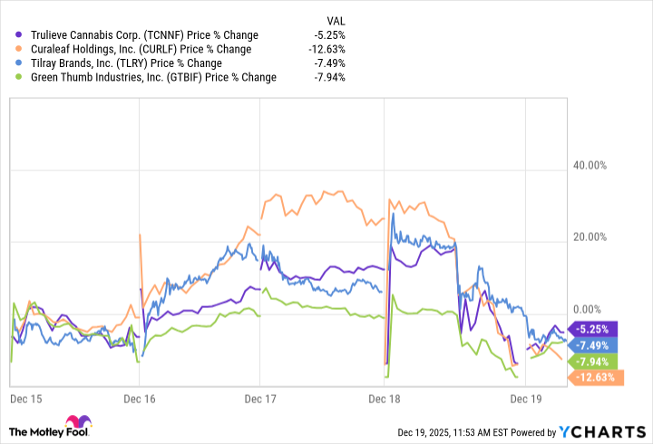 Dear reader, if you’ve ever wondered why the stock market behaves like a medieval knight with a compass, you’re not alone. This week, cannabis stocks danced like a dervish, fueled by whispers of President Trump’s “I’ll fix it” approach to drug policy. Trulieve, Curaleaf, Tilray, and Green Thumb Industries-our favorite players in the “green gold” game-saw their shares wobble like a drunk tightrope walker.