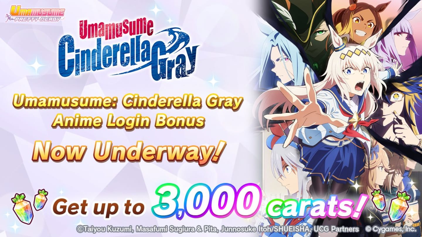 Fans of Umamusume are in for a treat! The second part of the Cinderella Grey anime has started, and Cygames is giving players of the Umamusume gacha game a bonus: 300 Carats for free with each new episode. Since this part of the anime has ten episodes, players can earn a total of 3,000 Carats just by watching!