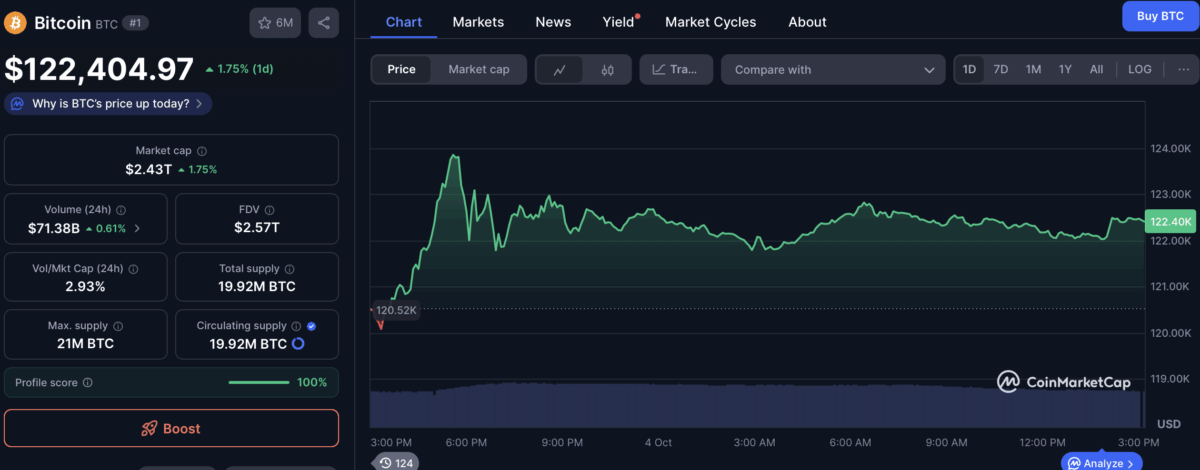 Meanwhile, this surge briefly pushed Bitcoin’s price above $123,996 on Friday, according to TradingView data, the highest level since August 14. At the time of writing, Bitcoin is trading for $122,396, up 1.75% over the last 24 hours. It’s not a straight line, but hey, who’s complaining when the lines wiggle like a Broadway chorus? 🤑🎭