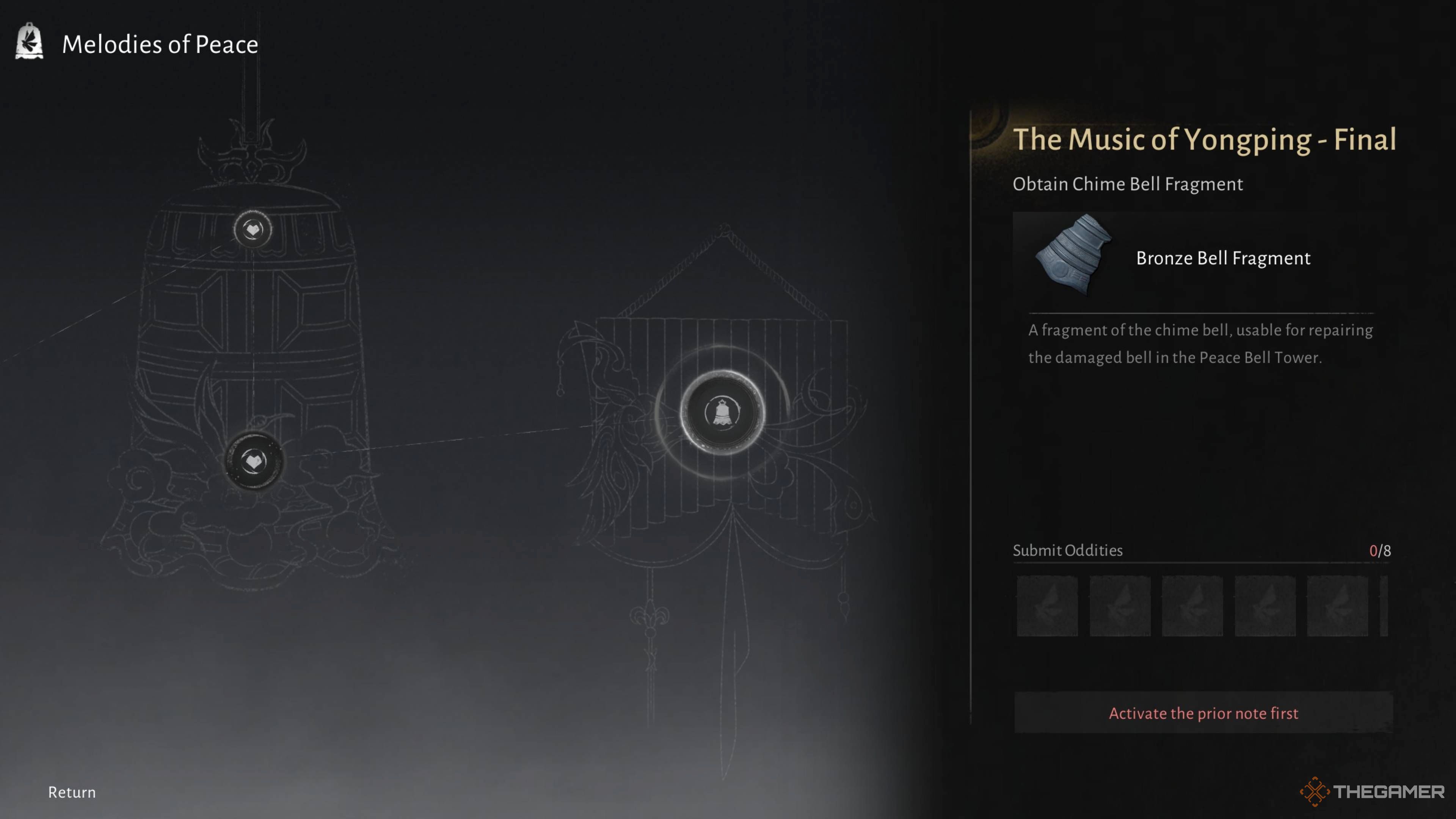 Once you’ve collected enough Oddities for Qi Sheng and received the Bronze Bell Fragment, return to Peace Bell Tower. Qi Sheng will actually tell you to do this!