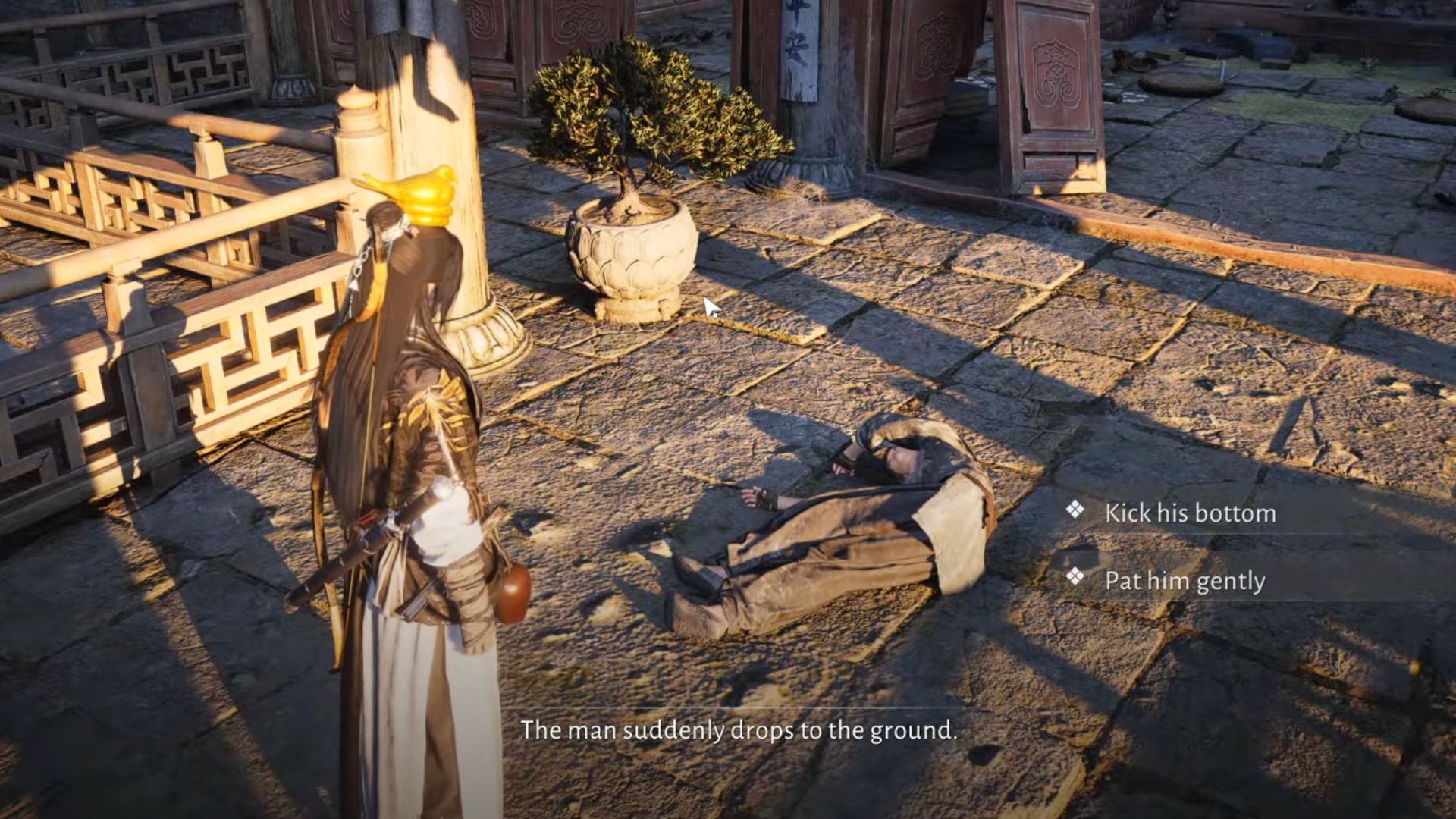 Begin your journey by finding the Wayfarer in Verdant Wilds and speaking with them. Next, travel to the General’s Shrine in Qinghe. You’ll find Zhang San repeatedly bowing, clearly exhausted and unresponsive. Wait for him to collapse, then gently wake him up – a nudge or pat will do. Once he’s awake, he’ll drop a booklet that leads you to a strange area on the shrine floor.