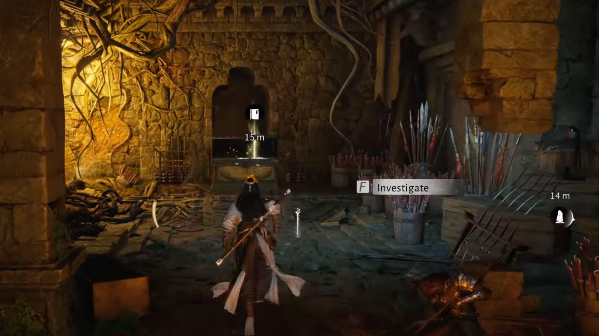 Once the wall falls, quickly shoot the barrels in the newly opened room to take out the bandits before they can surround you. Burn the vines to the right to find a hidden chest. As you go down the stairs, be sure to check the body – you’ll learn a new skill called Cloud Steps, which will help you jump, cross gaps, and fight.